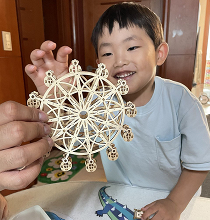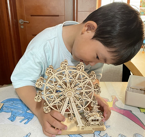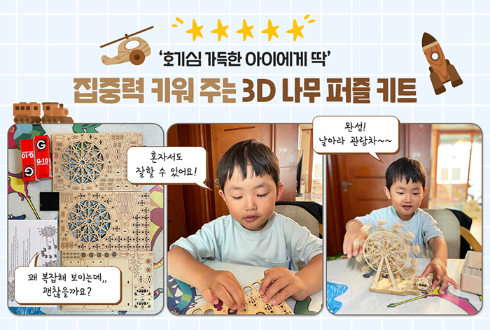 배송받은 키트는 설명서 1장, 나무 퍼즐 3판, 순간접착제 2개, 사포 1장으로 구성되어 있었는데요. 완성품이 단순 관상용이 아닌 손으로 직접 돌려볼 수 있는 형태라 아이가 더 흥미를 느꼈던 것 같아요. 만드는 과정도 어렵지 않았습니다. 나무 퍼즐을 판에서 분리해 사포로 이음새를 다듬고, 총 12칸의 관람차를 조립해 줍니다. 조립한 것을 기둥과 바닥에 고정하고 장식용으로 작은 마차까지 더해주면 끝! 조립하는 중 퍼즐 조각이 부러지는 사고가 있었지만, 동봉된 순간접착제로 쉽게 붙일 수 있어 편리했습니다. 아이가 완성된 작품을 일요일 저녁에 이모와 사촌 형에게도 ‘내가 만든 것’이라며 자랑했답니다. 좋은 시간 보낼 수 있게 해주셔서 감사합니다.