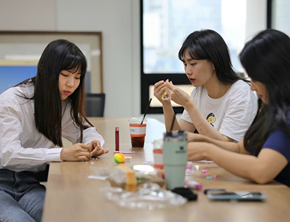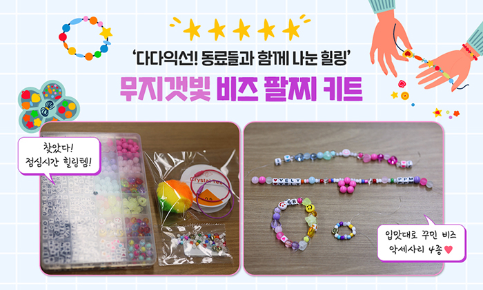 저는 점심시간을 이용해 약 20분 동안 동료들과 함께 키트를 체험했는데요. 손재주가 없어 원하는 모양의 팔찌나 반지를 만들지 못하면 어떡하나 걱정했는데, 결과물과 관계없이 만드는 과정이 무척 즐거웠습니다. 아무 생각 없이 구슬을 하나하나 꿰다 보면 색색의 비즈가 쌓여가는 게 예뻤고, 스트레스도 풀렸습니다. 친한 동료들과 함께 만들어서 더욱 행복했어요. 혼자 만드는 중에 다 꿰어놓은 반지를 놓쳤다면 짜증만 났을 것 같은데, 옆에 있는 동료들과 같이 웃으면서 다시 만들 수 있어서 재미있는 추억이 되었습니다. 아직 비즈가 많이 남아 한 번 더 만들 예정입니다.