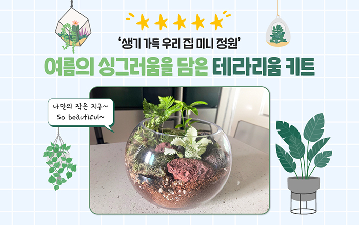 공지사항에 올라온 것을 보고 호기심으로 신청했습니다. 우선 화분이 유리로 둥글게 되어있어서 너무 좋았고, 난이도는 나름 재미를 느낄 정도였는데요. 아내와 함께 테라리움을 만들면서 생물의 위대함을 느낄 수 있었습니다. 만드는 과정을 간단히 설명하자면, 첫 번째로 난석을 바닥에 조금 깐 뒤 흙(배양토)을 다 채워줍니다. 그리고 키트에 들어 있는 식물을 심어주면 되는데요. 마지막으로 이끼와 돌로 장식을 하고 화산석 등으로 장식을 예쁘게 해주면 완성입니다! 저는 화분이 작은 지구라고 생각합니다. 평소에도 생물, 동물 등에 관심이 많은데요. 흙 속의 영양분을 흡수해 생명체가 살아가는 모습이 너무 아름답고, 멋있고 소중하게 느껴집니다. 자연을 사랑하는 다른 분들께도 테라리움 키트 추천해 드립니다.
