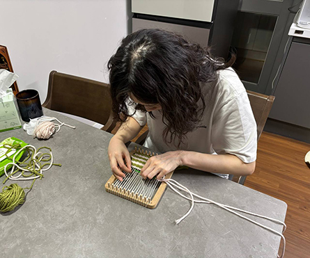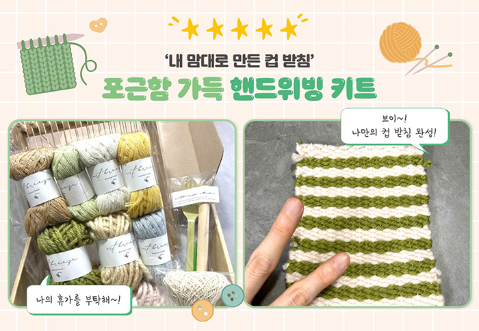 전 이틀의 휴가를 이용해 체험했습니다. 먼저 위빙룸에 경사실을 돌려 가며 걸어 주고, 마지막 기둥에 고정해 틀을 만들어 줍니다. 이후 여러 위빙 기법을 사용하여 만들고 싶은 모양으로 짜면 됩니다. 모양이 완성됐다면 위빙룸 뒤의 경사실을 잘라 틀에서 분리한 후, 튀어나온 실들을 정리하면 완성! 평소 뜨개질 취미가 있으시거나 창의력이 풍부하신 분이라면 더욱 귀엽고 재미있는 모양의 컵 받침을 만드실 수 있을 거예요!