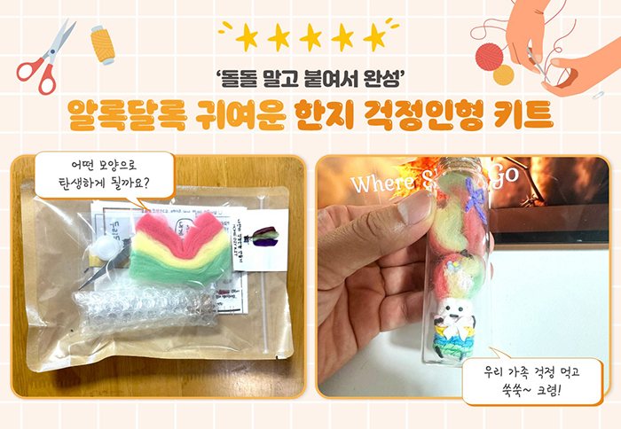 다른 생각 없이 무언가에 집중하는 시간을 가지고 싶어 걱정인형 키트를 신청했습니다. 키트는 인형의 머리카락이 될 양모와 몸통, 옷, 얼굴이 될 한지, 유리병 등으로 구성되어 있었어요. 저는 주말에 가족과 함께 만들었는데요. 조금 집중이 필요하긴 하지만 과정은 단순했습니다. 한지를 말아 몸통을 만들고 옷과 눈, 입, 팔, 다리를 만들어 붙입니다. 그 후 양모를 양 갈래로 묶거나 땋는 등 원하는 스타일로 만들어 붙이고 유리병에 넣어 주면 완성입니다! 만들어 놓고 보니 알록달록한 색상이 너무 예쁘더라고요. 무엇보다 아이들이 정말 좋아했습니다. 평소 걱정을 잘 하지 않는 편이긴 하지만, 그래도 걱정거리가 생긴다면 제가 만든 걱정인형에게 말해 보려고 합니다!