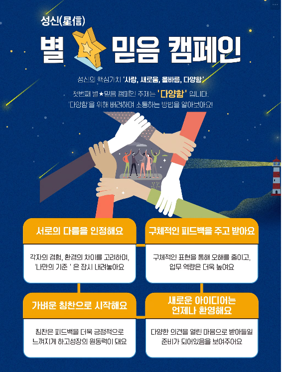 응원하기 위해 기획된 칭찬 전달 이벤트로 총 31건의 칭찬이 접수됐다. 이번 '성신人을 찾아라!'에서는 별★믿음 캠페인에서 다룬 4가지 소통 방식을 일상