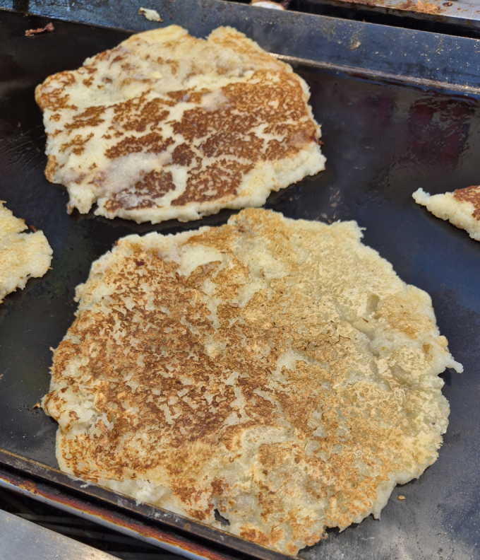 강원도 감자를 직접 갈아서 구워 겉은 바삭바삭하고 속은 촉촉한 맛이 일품입니다. 휴대폰만 보던 아이도 따끈한 감자전을 한입 맛보더니, 다음부터는