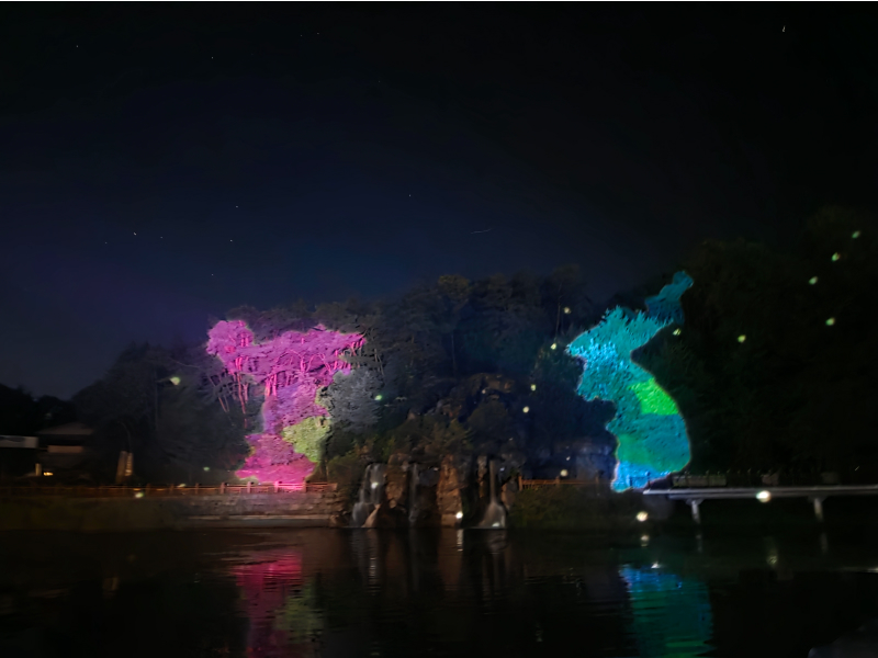 마지막 날은 제천으로 이동해 의림지를 찾았습니다. 고즈넉한 저수지를 거닐다가 해가 지자 기다리던 순간이 찾아왔습니다. 바로 인공폭포 미디어파사드! 폭포수를 스크린 삼아 흘러가는 색채와 그림들은 자연과 기술이 만난 새로운 예술 같았습니다.