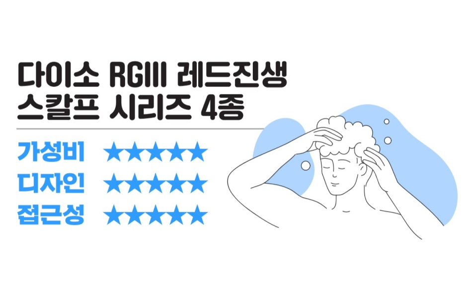 요즘 다이소에서 화장품이 잘 나온다고 하던데, 두피 케어 제품도 괜찮더라고요. 제가 사용한 제품은 ‘RGIII 레드진생 스칼프 시리즈 4종’이고 가격은 각 3,000원에서 5,000원으로 형성되어 있습니다. 딱 다이소다운 가격이라, 두피 관리를 처음 시작하시는 분들이 시도해 보기 좋은 것 같아요. 가성비 끝판왕 제품으로 두피를 건강하게 유지해 보세요. 탈모는 시작이 반입니다!