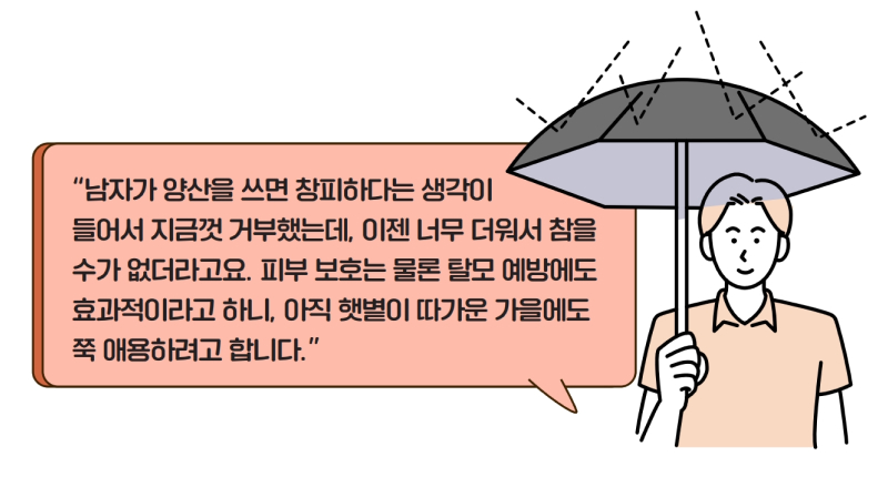그간 중장년층 여성의 필수템으로 여겨졌던 양산이 ‘국민 아이템’으로 부상했다. 체감 온도가 40도에 육박할 만큼 유독 찜통 더위를 자랑했던 올 여름, 도심 곳곳에서는 양산을 쓴 남성들을 쉽게 발견할 수 있었다. 온라인 패션 플랫폼 ‘무신사’에 따르면 7월 초 기준, 남성의 ‘양산’ 검색 건수가 전년 대비 10배 증가하기도 했다.