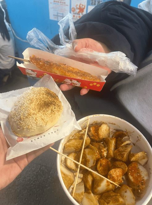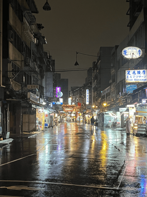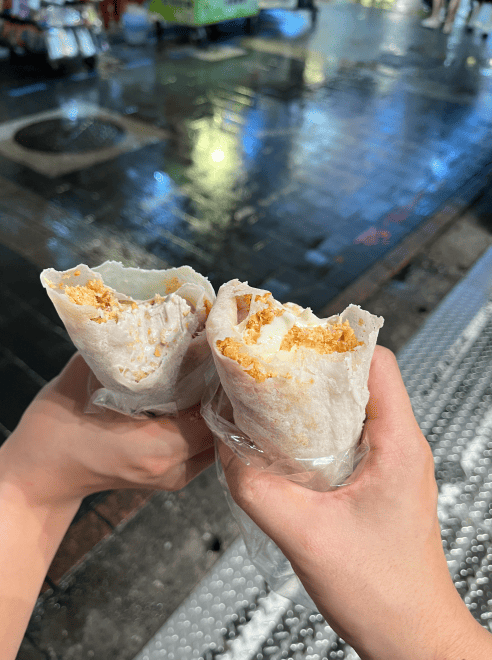 숙소에 돌아와서는 저녁 일정을 위해 바로 잠에 들었다. 두 시간 정도가 지났을 때, 우리는 잠에서 깨 스린야시장으로 향했다. 나와 보니 비가 더욱 굵게 내리고 있었다. 야시장을 온전히 즐기지 못하겠다고 생각했지만 먹기 위한 의지가 더 강해서였을까, 우리는 손바닥보다 큰 치파이, 겉바속촉 후추빵, 새송이버섯 구이, 킹크랩 맛살 튀김, 찹쌀 소시지, 땅콩 아이스크림까지 야무지게 맛보았다. 비록 가게 처마 아래에서 간신히 비를 피하며 먹어야 했지만, 여행지다운 풍경이라 생각하니 이 또한 즐거웠다.